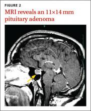 Magnetic resonance imaging (MRI) of our patient’s brain revealed a pituitary adenoma (FIGURE 2). Based on that and the patient’s elevated GH and IGF-1 levels, we diagnosed acromegaly due to a pituitary adenoma.