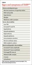 Although thyrotoxicosis is more common in women, THPP has a predilection for men (20:1).1,3-6 THPP occurs in patients with hyperthyroidism, most commonly from Graves’ disease,1,6 who are exposed to certain precipitating factors, such as exercise, carbohydrate loading, high-salt diet, excessive alcohol consumption, trauma, cold exposure, infection, menstruation, or emotional stress.1,6 THPP can also occur in people taking medications such as corticosteroids, β2-adrenergic bronchodilators, epinephrine, acetazolamide, insulin, nonsteroidal anti-inflammatory drugs, thyroxine, amiodarone, and tiratricol.1,5,6 THPP is more common in the summer.1