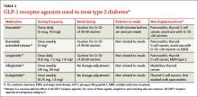 Dosing varies with each agent and includes twice daily before meals for exenatide, once daily (independent of meals) for liraglutide, and once weekly for exenatide extended-release, albiglutide, and dulaglutide. These agents should not be used for patients with a history of pancreatitis or a personal or family history of medullary thyroid cancer or multiple endocrine neoplasia type 2. Because exenatide is cleared through the kidneys, its use is contraindicated in patients with a creatinine clearance <30 mL/min or end-stage renal disease. Caution is advised for its use in patients with a creatinine clearance of 30 to 50 mL/min.11