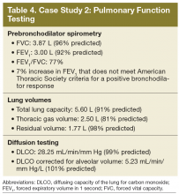 Her vital signs, physical examination pulmonary function testing with spirometry, lung volumes, and diffusion testing were all normal (Table 4). Bronchial challenge to methacholine demonstrated airways hyperresponsiveness at a PC[-20] FEV 1 of 1.25 mg/mL. High-resolution chest CT did not demonstrate air trapping, centrilobular nodules, or other evidence of chronic interstitial lung disease. A cardiopulmonary maximum multistage exercise test with arterial line placement showed normal exercise tolerance with the patient achieving 109% of the maximum predicted workload and 90% of predicted VO 2 max.