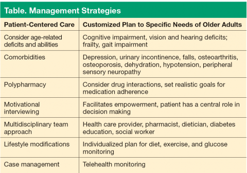 Several strategies can be deployed to overcome barriers in DM care. Of utmost importance is the need to provide patient-centered care with age-specific characteristics of older adults (Table). To foster mutual collaboration in DM care, HCPs need to ask patients about their health care goals. Patients often view their health through a functional and social perspective rather than from a biomedical perspective. In one study, 71% of patients said their most common health goal was to be independent with activities of daily living, which was more important than the specific details of DM care. 16 Preventing DM complications was among their secondary health care goals.