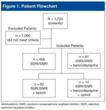 Demographic data that were collected included age, sex, comorbid mental health disorders, comorbid SUDs, and concomitant use of psychotropic medications at index date (baseline). Select comorbid mental health disorders (anxiety, schizophrenia, depression, bipolar disorder) and substance use disorders (alcohol, opioid, illicit drug) also were identified. Data on insomnia and pain comorbidities (headaches or migraines; neuropathy; head, neck, back, arthritis, or joint pain) were collected, as these comorbidities could be indications for prescribing benzodiazepines and opioids. Concomitant baseline use of classes of psychotropic medications (antipsychotics, non-SSRI/SNRI antidepressants, mood stabilizers, anxiolytics, nonbenzodiazepine sedatives/hypnotics) also were documented. Last, hospitalizations within 6 months before the initial SSRI/SNRI prescription date were noted.