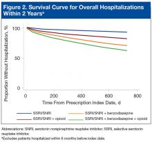 Concomitant use of a non-SSRI/SNRI antidepressant and a mood stabilizer was also similar across groups. Rates of anxiety and insomnia were higher in the SSRI/SNRI and benzodiazepine therapy group than in the SSRI/SNRI monotherapy group. As expected, rates of comorbid pain were higher in the 2 groups on concurrent opioid therapy. The proportion of female patients and the incidence of bipolar disorder and antipsychotic use were higher in the SSRI/SNRI, benzodiazepine, and opioid therapy group. One-fourth to one-third of patients across all study groups had an active diagnosis of a select SUD.With the SSRI/SNRI monotherapy group as the referent, all concurrent therapy groups were at significantly increased risk for overall hospitalization within 2 years after the index date (Tables 2 & 3, Figure 2).