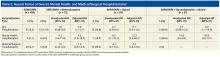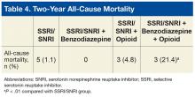 After the patients who were hospitalized within 6 months before the index date in the SSRI/SNRI, benzodiazepine, and opioid therapy group were excluded, there were no medical/surgical hospitalizations. The overall cohort’s 2-year all-cause mortality was significantly higher (P < .01) in the SSRI/SNRI, benzodiazepine and opioid therapy group (21.4%) than in the SSRI/SNRI monotherapy group (1.1%) (Table 4).