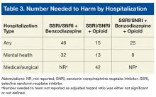 The SSRI/SNRI and benzodiazepine therapy group had an AHR of 5.5 (95% CI, 1.6-18.7) and an NNH of 32; the SSRI/SNRI and opioid therapy group had an AHR of 12.3 (95% CI, 3.3-46.2) and an NNH of 13; and the SSRI/SNRI, benzodiazepine, and opioid therapy group had an AHR of 20.0 (95% CI, 4.0-101) and an NNH of 8.Although the risk for medical/surgical hospitalization was not significantly increased in the SSRI/SNRI and benzodiazepine therapy group (AHR, 1.9; 95% CI, 0.67-5.6), a significant difference was found in the SSRI/SNRI and opioid therapy group (AHR, 4.4; 95% CI, 1.6-12.0; NNH, 42).