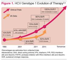 Hepatitis C virus (HCV) infection remains a significant problem in the VA system, with over 174,000 current actively infected patients. 1 Despite the availability of antiviral treatment since the early 1990’s, only approximately 26% of patients have ever been treated. These treatments required the use of pegylated interferon alfa (PEG) and ribavirin (RBV), which are associated with significant adverse events (AEs) that prevented many from receiving the treatment. Of those treated, only a minority achieved a sustained virologic response (SVR), due to the limited efficacy of the treatments (Figure 1). 2 With the advent of new direct-acting antiviral (DAA) treatments in 2011, treatment efficacy improved.