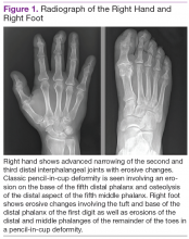 Radiographic data, such as X-rays of the hands and feet, can confirm the clinical distribution of joint involvement and show evidence of erosive changes. Further destructive changes include osteolysis (bone resorption) that may cause the classic pencil-in-cup deformity, typically seen in arthritis mutilans (Figure 1). 3 Other radiographic evidence of PsA can include proliferative changes with new bone formation seen along the shaft of the metacarpal and metatarsal bones. 3 Patients with axial involvement can have evidence of asymmetric sacroiliitis, which can be seen on radiographs. Asymmetric syndesmophytes, or bony outgrowths, can also be seen throughout the axial spine. 3