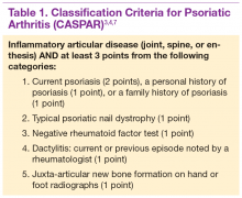 Diagnosis is based on the history and clinical presentation of a patient with the help of laboratory work and radiographs. Other forms of arthritis (such as rheumatoid arthritis, crystal arthropathies, osteoarthritis, ankylosing spondylitis) should be excluded. Given the varied presentation of PsA, classification criteria have been developed to assist in clinical research. Classification Criteria for Psoriatic Arthritis (CASPAR) have been developed and validated as an adjunct to clinical diagnosis and a source for clinical research (Table 1). 7 Musculoskeletal pain in patients with psoriasis can be due to causes other than PsA, such as osteoarthritis and gout. A close working relationship in a combined rheumatology/dermatology clinic is vital to providing optimal diagnostic and treatment care for patients with psoriasis and PsA. 8