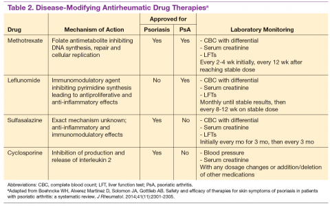 Leflunomide is another traditional oral DMARD that is administered daily. It has be shown to be effective in PsA, with only a modest effect in improving skin lesions. 12 Laboratory monitoring is identical to that required with MTX. Adverse effects (AEs) include diarrhea and increased risk of elevated transaminases. 9 Sulfasalazine (SSZ) is also used as a traditional DMARD and shown to have an effective clinical response in treating peripheral arthritis but not in axial or skin disease. 9,12 Not all studies have shown effective responses to SSZ. The primary AE is gastrointestinal, making this a frequently discontinued medication. 2 Cyclosporine is more commonly used in psoriasis but can be used on its own or with MTX for treating patients with PsA. 10 It is often not tolerated well and frequently discontinued, due to major AEs, including hypertension and renal dysfunction. 2,10
