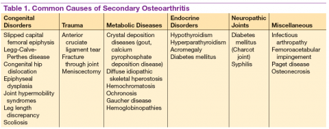 Osteoarthritis encompasses a wide spectrum of common conditions with similar pathophysiology. Most of these conditions share similar historic features, including pain during or after use and stiffness after prolonged periods of inactivity. Other common symptoms include swelling, joint locking or “cracking,” instability, and joint fatigue. Patients may perceive OA discomfort in different ways. Whereas one patient with knee OA may describe a sharp, gnawing pain, another may experience painless swelling and instability. Although OA is mainly considered a localized disease, patients may present with multiple areas of pain, suggesting a more generalized pattern. Patients with OA may have short periods of morning stiffness and “gelling,” but prolonged stiffness suggests the presence of inflammatory arthritis.