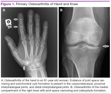 In the hands, a particular pattern is noted involving the PIP and DIP joints with characteristic sparing of the MCPs (Figure 1A). The first CMC joint is also commonly involved, with bony osteophyte formation and joint space loss. In the knee and hip, loss of joint space with subchondral bone cyst and osteophyte formation is common (Figure 1B).