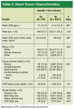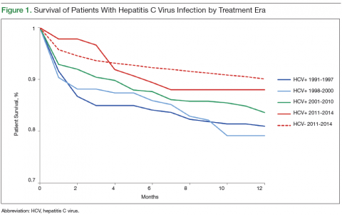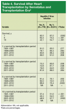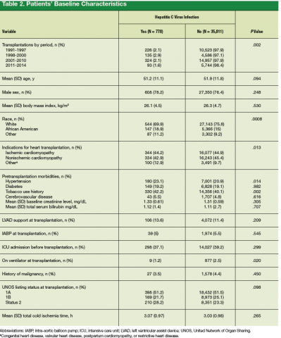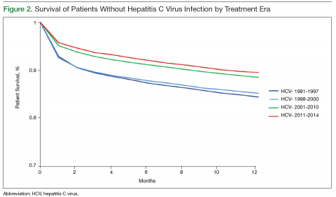 Clinical outcomes of heart transplantation (HTx) historically have been inferior in patients with HCV infection. 8,9 The authors hypothesized that the literature on HTx outcomes has not accounted for the improvements in HCV infection treatment options that have occurred since the 1990s. In the study reported here, United Network of Organ Sharing (UNOS) data on adult HTx was used to evaluate clinical outcomes of HCV infection over 4 treatment eras.
