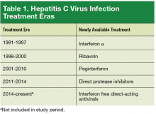 The authors analyzed UNOS data on adult HTx from January 1991 to March 2014. Two groups were created: patients with HCV infection (HC+) and noninfected patients (HC–). Eligible patients were aged > 18 years. Hepatitis C virus status was defined with antibody testing at time of HTx. Patients with multiorgan transplantation or with hepatitis B virus or HIV infection were excluded. For comparison of post-HTx survival, the 23-year study period was divided into 4 eras reflecting the evolution in HCV infection treatment options in the U.S. (Table 1). The first medication was interferon α (IFN-α), which was used alone (first era, 1991-1997) and then with the newly introduced ribavirin (second era, 1998-2000). The combination of IFN-α and ribavirin increased sustained virologic response rates, but the rates of adverse effects (AEs), such as cytopenia and depression, were high, and many patients could not tolerate the extended (48-week) regimen. 10,11
