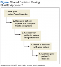 The goals of successful SDM include a decrease in patient anxiety and an increase in trust in the health care team, ideally leading to improvement in adherence and patient outcomes.8,10-12 Improved patient-clinician communication conveys openness to discuss any future concerns. Furthermore, SDM does not need to take a significant amount of a clinician’s time to create an environment of consideration and goal formation. Training in communication skills may be helpful for those unfamiliar with SDM techniques. Patients are most likely to participate in the SDM process when they are comfortable speaking with clinicians and have some knowledge about their specific disease process.13
