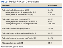 In addition, the average personnel cost per partial-fill prescription was determined. Average workload expenditure per partial fill was calculated by filling a subset of 10 test prescriptions and multiplying the average time spent by an average of the general station (GS) rate for pharmacists and technicians. The average hourly rate of a GS-12 pharmacist was calculated based on an average of the 10 available pay grades within the GS-12 ranking. The average hourly rate of a GS-6 pharmacy technician was calculated based on an average of the 10 available pay grades within the GS-6 ranking.3 The average workload expenditures were calculated using the following equations: