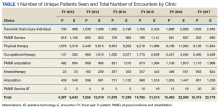 In FY 2012, there were 4,397 unique individuals receiving telerehabilitation in the selected telerehabilitation clinics. By FY 2017, this number had grown to 16,319 veterans. Similar increases were seen for total encounters, growing from 6,643 in FY 2012 to 22,179 in FY 2017 (Figure 2). The rate of the increase for the number of unique patients seen and telerehabilitation encounter totals across years were higher from FY 2012 to FY 2015 than from FY 2015 to FY 2017.Clinical video telehealth can be used to deliver functional circuit exercise training to older veterans in remote locations.