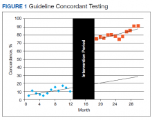 This percentage increased 59.5% from its immediate preintervention estimate of 14.5% to the immediate postintervention estimate of 74.0% (Table 2, Figure 1). On average during the postintervention year, the percentage of tests ordered that met guideline concordance was 81.2% (95% CI, 77.5%-84.8%), continuing to increase by 1.3% (95% CI, 0.7%-2.05%) each month. This rate of continuing increase was not statistically different from the preintervention period.