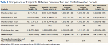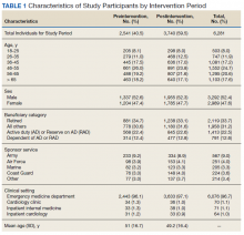 There were a total of 6,281 patients in the study population. More patients were seen during the postintervention period than in the preintervention period. The mean age of patients was slightly higher during the preintervention period (Table 1).