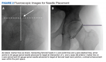 Cases included in the study were performed over an 8-month period in 2017. Case images recorded in IntelliSpace PACS Radiology software (Andover, MA) were included by creating a list of all cases performed and documented using the major joint injection procedure code. The cases reviewed began with the most recent cases. Two research team members (1 radiologist and 1 interventional pain physician) reviewed the series of saved images for each patient and the associated procedure report. The research team members documented and recorded de-identified study data in Microsoft Excel (Redmond, WA).
