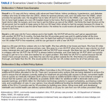 Deliberation 1: What criteria should be used to prioritize patients for receiving civilian care paid for by the VHA? To elicit preferences on the central question of this deliberation, participants were presented with 8 real-world cases that were based on interviews conducted with Choice Act-eligible veterans (Table 2 and eAppendices A