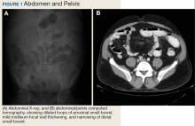 A physical examination revealed a distended abdomen with mild tenderness. He had no inguinal or ventral hernias. He also had no abnormal skin lesions. A rectal examination did not reveal any masses or blood. His laboratory values were normal. X-ray and computed tomography (CT) scan revealed dilated loops of proximal small bowel, mild wall thickening in a segment of the midileum, and narrowing of the distal small bowel suggestive of a partial small bowel obstruction (Figure 1). A 1-cm nonspecific omental nodule also was seen on the CT scan, but no enlarged lymph nodes or mesenteric calcifications were seen. There was no thickening of the terminal ileum.