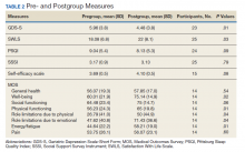 At the start of the class, the mean (SD) reports of participants were mild depressive symptoms 5.96 (3.8) on the GDS scale, moderate levels of self-efficacy 3.69 (0.5) on the self-efficacy scale, and moderate levels of satisfaction with life 18.08 (6.8) on the SWLS scale (Table 2). Data from 25 of 31 veterans who completed both pregroup and postgroup surveys were analyzed and paired samples t tests without corrections indicated a reduction in depressive symptoms (P = .01), improved self-efficacy (P = .08), and improved satisfaction with life (P = .03). There were no significant differences in self-reported sleep quality or perceived social support from pregroup to postgroup evaluations. Because the sample size was smaller for the MOS-36, which was not used until group 3, and the subscales are composed of few items each, we conducted exploratory analyses of the 8 MOS-36 subscales and found that well-being, physical functioning, role limitations due to physical and emotional functioning, and energy/fatigue significantly improved over time (Ps < .04).