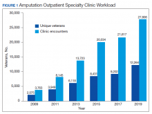 Over the past 10 years, the ASoC has focused on ensuring that an amputation specialty care team addresses the needs of veterans with amputation. Between 2009 and 2019, the VA amputation specialty clinics saw a 49% annual increase in the number of unique veterans treated and a 64% annual increase in the number of total clinic encounters (Figure 1).6 This growth is attributed to the larger amputation population receiving enhanced access to the specialty team providing consistent, comprehensive, lifelong care.