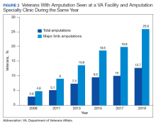 Between 2009 and 2019, the number of veterans with limb loss receiving care in the VA increased 34%.6 With advances in vascular surgery and limb-sparing procedures, minor amputations are more common than major limb amputations and more below-knee rather than above-knee amputations have been noted over the same time. However, the high prevalence of DM in the overall veteran population places about 1.8 million veterans at risk for amputation, and it is anticipated that the volume of limb loss in the veteran population will continue to grow and possibly accelerate.5