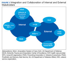 Collaboration with external partners has been an important element in the system of care development. The VA has partnered extensively with the US Department of Defense (DoD) to transition service members with amputation from the military health care system to the VA. The VA and DoD also have collaborated through the development and provision of joint provider trainings, clinical practice guidelines, incentive funding programs, and patient education materials. Congress authorized the Extremity Trauma and Amputation Center of Excellence (EACE) in 2009 with the mission to serve as the joint DoD and VA lead element focused on the mitigation, treatment, and rehabilitation of traumatic extremity injuries and amputations. The EACE has several lines of effort, including clinical affairs, research, and global outreach focused on building partnerships and fostering collaboration to optimize quality of life for those with extremity trauma and amputation. The Amputee Coalition, the largest nonprofit consumer-based amputee advocacy organization in the US, has been an important strategic partner for the dissemination of guideline recommendations and patient education as well as the development and provision of peer support services.
