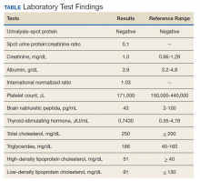 On physical examination, the patient had no periorbital edema, jugular venous pressure of 8 cm H2O, negative hepatojugular reflex, unremarkable cardiac and lung examination, and grade 2+ posterior tibial and dorsalis pedis pulses bilaterally. He underwent extensive laboratory evaluation for potential underlying causes, including nephrotic syndrome, cirrhosis, hypothyroidism, and CHF (Table). Valproate levels were initially subtherapeutic on admission (< 10 µg/mL, reference range 50-125 µg/mL) then rose to within therapeutic range (54 µg/mL-80 µg/mL throughout admission) after neurology recommended increasing the dose from 1,000 mg daily to 1,500 mg daily. His measured valproate levels were never supratherapeutic.