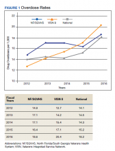 This descriptive study compared the rate of annual drug overdoses (per 1,000 enrollees) between NF/SGVHS, VISN 8, and VHA national from 2012 to 2016. It also compared the annual rate of suicide per 100,000 enrollees across these 3 levels of the VHA. The overdose and suicide rates and numbers are mutually exclusive, meaning the VISN 8 data do not include the NF/SGVHS information, and the national data excluded data from VISN 8 and NF/SGVHS. This approach helped improve the quality of multiple level comparisons for different levels of the VHA system.