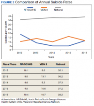 Figure 2 shows the annual rates (per 100,000 individuals) of suicide for NF/SGVHS, VISN 8, and VHA national. The suicide pattern for VISN 8 shows a cyclical acceleration and deceleration trend across the study period. From 2012 to 2014, the VHA national data show a steady increase of about 1 per 100,000 from year to year. On the contrary, NF/SGVHS shows a low suicide rate from year to year within the same period with a rate of 10 per 100,000 in 2013 compared with the previous year. Although the NF/SGVHS suicide rate increased in 2016 (10.4 per 100,000), it remained lower than that of VISN 8 (10.7 per 100,00) and VHA national (38.2 per 100,000).