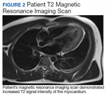 A physical examination was unremarkable. The initial laboratory report showed no leukocytosis, anemia, thrombocytopenia, electrolytes derangement, abnormal kidney function, or abnormal liver function tests. Initial troponin was 0.25 ng/mL, erythrocyte sedimentation rate (ESR) was 40 mmol/h and C-reactive protein (CRP) was 120.2 mg/L suggestive of acute inflammation. A urine drug screen was negative. D-dimer was < 0.27. An electrocardiogram (ECG) showed diffuse ST segment elevation (Figure 1). An echocardiogram showed normal left ventricle size, and function with ejection fraction 55 to 60%, normal diastolic dysfunction, and trivial pericardial effusion. Magnetic resonance imaging (MRI) showed increased T2 signal intensity of the myocardium suggestive of myopericarditis (Figure 2). A computed tomography (CT) angiogram of the coronary arteries showed no significant stenosis.
