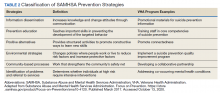 In order to provide a menu of available options for the learning collaborative and resulting toolkit, PSCI-SPC uses a logic model to compare the components of the VHA suicide prevention program, as well as other similar veteran and military suicide prevention programs.7,12,14,21,33,34 These programs are categorized into 2 types of prevention frameworks, the USI model as described above, and the SAMHSA Strategic Prevention Framework (Table 2).35 The SAMHSA framework was designed to promote mental health and prevent substance abuse, yet the derived classification is also applicable to suicide prevention programs.35 The results of the logic model comparison form the basis of the best practice interventions for the learning collaborative and initial toolkit. In addition to the best practice interventions, the toolkit consists of documents describing how to develop a veteran suicide prevention learning collaborative, as well as tools for learning collaborative members. Current tool development includes workbooks to guide collaborative members through the implementation process, guides for community organizations in implementing suicide prevention screening and risk assessment, a standard operating procedure for suicide prevention in a veterans court, and peer support training for veteran suicide prevention.