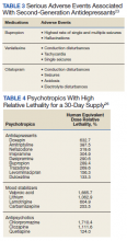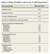 Antidepressants accounted for 144 fatalities from 56,891 single-substance exposures (mortality rate: 0.3%).16 Nelson and Spyker performed a study to determine the morbidity and mortality index for psychotropic agents based on exposure reports from the National Poison Data system and found that tricyclic antidepressants (TCAs) and monoamine oxidase inhibitors (MAOIs) had the highest morbidity and mortality rates among all drugs used to treat depression.23 As a class, TCAs have a mortality index of 40.7 per 10,000 exposures and are associated with higher rates of acidosis, cardiac conduction problems, respiratory depression, and seizures (Table 2).23 Amitriptyline accounted for 39.5% of deaths from antidepressants.23 Among newer antidepressants, citalopram, venlafaxine, and bupropion have been found to be the most hazardous.23 Citalopram and venlafaxine have morbidity indices that are 4- to 5-fold higher than sertraline. Adverse events associated with bupropion, venlafaxine, and citalopram, such as seizures, conduction disturbances, hallucinations, and tachycardia contribute to the morbidity and mortality related to these medications (Table 3).