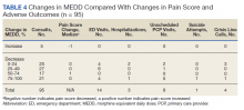 Eight patients had a history of substance use disorders (SUDs) and 8 had a history of a mood disorder or psychosis. One patient had both SUD and a mood/psychosis-related mental health disorder, including a reported suicidal attempt/ideation at an ED visit and a subsequent hospitalization. A similar number of AEs occurred in patients with decreases in MEDD of 0 to 24% compared with those that received more aggressive tapers of 75 to 100% (Table 4).
