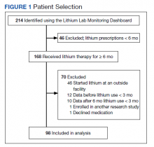 A total of 214 patients with an active prescription for lithium were identified on the Lithium Lab Monitoring Dashboard on October 31, 2017. After exclusion criteria were applied, 98 patients were included in the study (Figure 1). The 2 most common reasons for exclusion were due to patients not being on lithium for at least 6 months and being initiated on lithium at an outside facility. One patient was enrolled in a lithium research study (the medication ordered was lithium/placebo) and another patient refused all psychotropic medications according to the progress notes.
