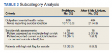 The results of this study suggest lithium may have a role in reducing suicidality in a veteran population. There was a statistically significant reduction in hospitalizations for suicide attempt and suicidal ideation after at least 6 months of lithium use. These results are comparable with a previously published study that observed significant decreases in suicidal behavior and/or hospitalization risks among veterans taking lithium compared with those not taking lithium.17 Our study was similar in respect to the reduced hospitalizations among a veteran population; however, the previous study did not report a difference in suicide attempts and lithium use. This could be related to the longer follow-up time in the previous study (3 years) vs our study (9 months).