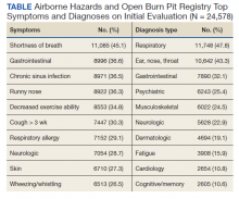 We reviewed and analyzed AHOBPR operations and VA data from 2014 to 2020. Our analyses were limited to veterans seeking evaluation as well as their corresponding symptoms and HCP’s clinical impression from the electronic health record. As of September 20, 2021, 267,125 individuals completed the AHOBPR. The mean age was 43 years (range, 19-84), and the majority were male (86%) and served in the Army (58%). Open-air burn pits (91%), engine maintenance (38.8%), and convoy operations (71.7%) were the most common deployment-related exposures.