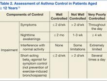 Determination of the level of control was based on the 2007 national asthma guidelines. The guidelines state that the level of control can be determined by either asthma symptoms or by peak flow evaluation. 19 Because of the language barrier that sometimes arises with the treated population, the use of symptom-based evaluation has been observationally superior to providing peak flow meters for home use. At each visit, patients were interviewed using tables from the asthma guidelines. Table 2 is an abbreviated portion of the guidelines representing the assessment tool used by the clinic. The level of control was determined by selecting the column with the highest severity of impairment. 19