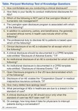 Simulations average 5 to 7 minutes and are followed by a debriefing, including simulation participants, workshop facilitators, and the professional actor, who remain in character. By the end of each 2-day workshop, all attendees have participated in multiple small-group simulations of both clinical and institutional disclosures. Pre- and postworkshop knowledge questions and program evaluation data are collected with immediate-response polling technology used throughout the workshop.