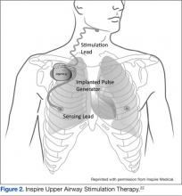 Another study of hypoglossal nerve stimulation (HNS) evaluated 21 patients who were unable to tolerate CPAP therapy. The researchers found significant improvement in AHI (43.1 + 17.5 to 19.5 + 16.7); Functional Outcomes of Sleep Questionnaire (14.4 + 2.0 to 16.7 + 2.2); ESS (12.1 + 4.7 to 8.1 + 4.4); Beck Depression Inventory (15.8 + 9.0 to 9.7 + 7.6); and the Calgary Sleep Apnea Quality of Life Index (3.2 + 1.0 to 4.9 to 4.9 + 1.3). The researchers concluded HNS decreased OSA-related symptoms and the severity of OSA.21 At least one of these devices, the Inspire device, has been approved for use in Europe (Figure 2).22 In addition, the FDA has approve the Inspire Upper Airway Stimulation therapy for use in a subset of patients with moderate to severe OSA who are unable to use CPAP.23