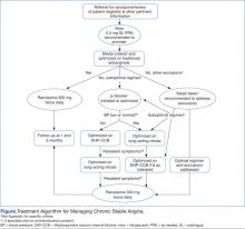 A generalized treatment algorithm was followed by the clinic for the management of CSA (Figure). It was highly recommended that all referred patients have an active prescription in the CPRS for short-acting sublingual nitroglycerin 0.4 mg in case of any acute episodes. Although other forms of short-acting nitroglycerin were available, sublingual nitroglycerin 0.4 mg was the preferred formulary medication at the time of the study.