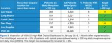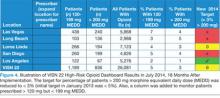 In 2012, the VA Pharmacy Benefits Management (PBM) in VISN 21 created a dashboard that allowed users to identify patients on high-dose opioid prescriptions. Structured query language code was used to extract data from the regional data warehouse and calculate MEDD for all patients with active opioid prescriptions. In 2013, VISN 22 expanded that dashboard to incorporate factors that could indicate a high risk for overdose or other adverse outcomes, including a history of depression, PTSD, substance abuse or high-risk suicide flag, and concomitant use of CNS depressant medications.