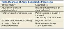 Acute eosinophilic pneumonia is likely to be underreported clinically. Presently, AEP is largely a diagnosis of exclusion; the current criteria for diagnosis are fairly rigid and rely on BAL while ruling out other identifiable causes (Table). Clinical suspicion should be raised in patients with a history of new-onset smoking or other airborne toxin exposure. The broad spectrum of clinical presentations and diagnostic findings leave important questions unanswered regarding the mechanisms of the disease.