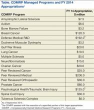 The Congressionally Directed Medical Research Programs (CDMRP), an office within the U.S. Army Medical Research and Materiel Command, has executed funding for research in 18 biomedical programs (Table). These programs touch the lives of service members, veterans, family members, and the general public. A partnership with the military, government, scientific community, survivors, patients, and their family members brings together spheres of stakeholders that typically might not otherwise collaborate and enables the CDMRP to complement other sources of research funding while focusing on research most directly relevant to each disease, condition, or injury.