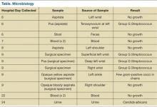On day 6, arthrocentesis of the left wrist was performed secondary to worsening of erythema and edema. The patient experienced new edema of the left shoulder and leukocytosis continued to trend upward (15.7 k/μL on day 6). Purulent aspirate (1.5 mL) was obtained from the fluctuance and tenosynovium of the left wrist. Empiric vancomycin 1 g IV twice daily and ceftriaxone 2 g IV daily were started and continued for 3 days. By this point in his hospital course, the patient had received 1 dose of etanercept. Prednisone and etanercept were previously discontinued because of the discovered infection. Blood cultures were drawn and had no growth (Table). Gastroenterology studies were limited to stool cultures and did not include colonoscopy. Leukocytosis began trending down.