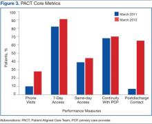 Before the implementation of this model, PACT data and metrics were posted in the clinics and briefly discussed at service-level meetings. However, this data-sharing approach rarely generated team members’ interest. By using coaching, personalized data reports that displayed team-specific information in comparison to the overall service and national VA goals were found to be a more effective technique for sharing data and performance metrics. National VA PACT core metrics tracked the following: (1) percentage of same-day appointments with PCP ratio—target 70%; (2) ratio of nontraditional encounters—target 20%; (3) percentage of continuity with PCP—target 77%; and (4) percentage of 2-day contact postdischarge ratio—target 75%. Figure 3 shows the improvements made as a facility from March 2011 (pre-PACT implementation) to March 2012 (post-PACT implementation).