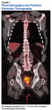 These imaging techniques are important in assessing surgical respectability or potential for radiotherapy. Brain metastasis is a rare finding (3.6% of cases); therefore, imaging of the brain is not routinely performed unless high clinical suspicion of brain involvement is present.3,5,8 FDG-PET scans have become more readily available in clinical practice over recent years and have found use in staging prostatic sarcoma. Leiomyosarcomas, in particular, have been found to be FDG avid, and SUVmax has been utilized as a likely predictor of tumor size and grade (Figure 2).11Treatment