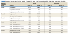 Twelve machine learning models were created in 6 experiments using the Apple Create ML and the Google AutoML (Table). To investigate recall and precision differences between the Apple and the Google ML algorithms, we performed 2-tailed distribution, paired t tests. No statistically significant differences were found (P = .52 for recall and .60 for precision).